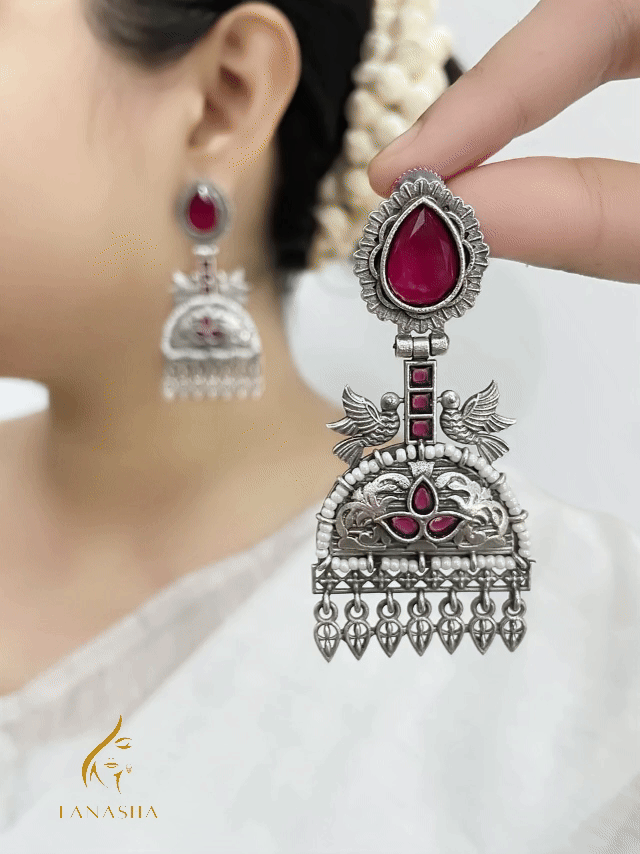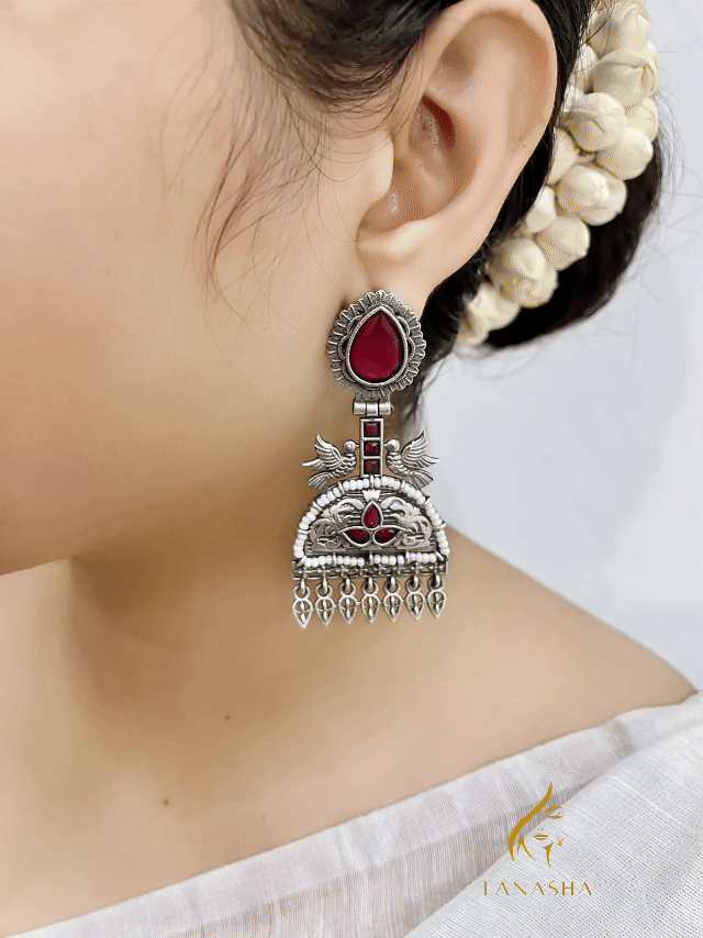 গাঢ় রুবি লাল পাথরের মোহ, সিলভার ফিনিশিংয়ের রাজকীয় কারুকাজ আর ঝুলন্ত ঘণ্টার সুরে সাজানো এই দুল যেন এক টুকরো ঐতিহ্যের ছোঁয়া। প্রতিটি অংশে আছে নকশার নিখুঁততা ও শিল্পীর হাতের ছোঁয়া।