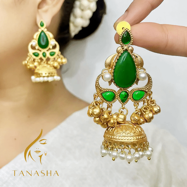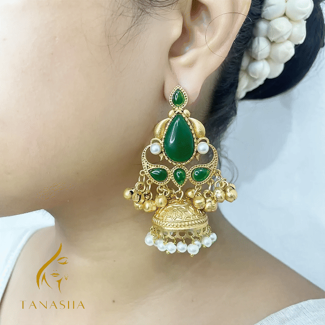 এর কেন্দ্রে রয়েছে উজ্জ্বল সবুজ এমেরাল্ড স্টোন, চারপাশে মুক্তা ও সোনালি ঘণ্টার সূক্ষ্ম সাজ। নিচের গম্বুজ আকৃতির অংশে মুক্তার দুলে তৈরি হয়েছে এক মনোমুগ্ধকর ঐতিহ্যবাহী লুক। এই ঝুমকা যেন তোমার সাজে যোগ করে প্রকৃতির সতেজতা আর রাজকীয় গ্ল্যামার একসাথে।