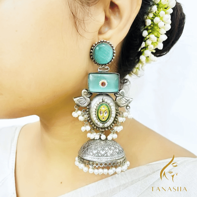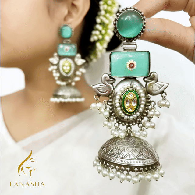 শান্ত নীল আভা আর অক্সিডাইজড সিলভারের রাজকীয় কারুকাজ—✨ জলধারা ময়ূর ঝুমকা আপনার লুককে এনে দেবে আলাদা দীপ্তি।