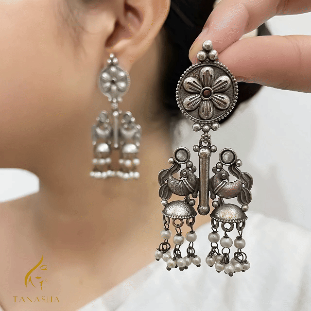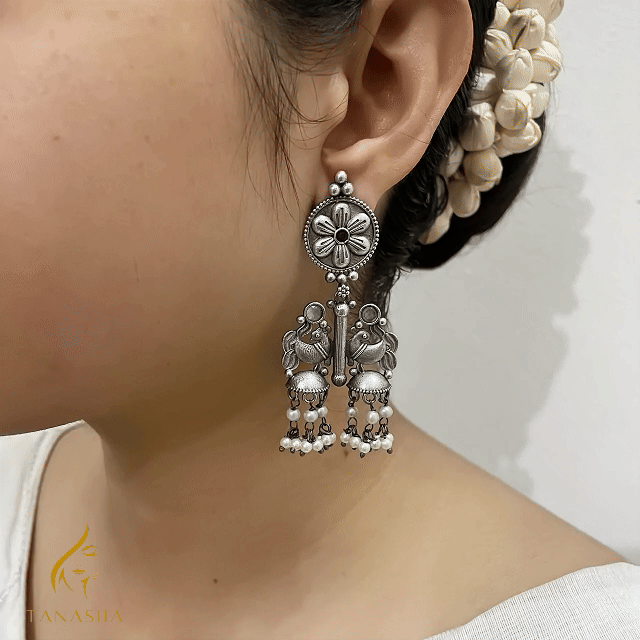 অক্সিডাইজড সিলভার ফিনিশে নির্মিত এই ঝুমকায় রয়েছে সূক্ষ্ম কারুকার্য —