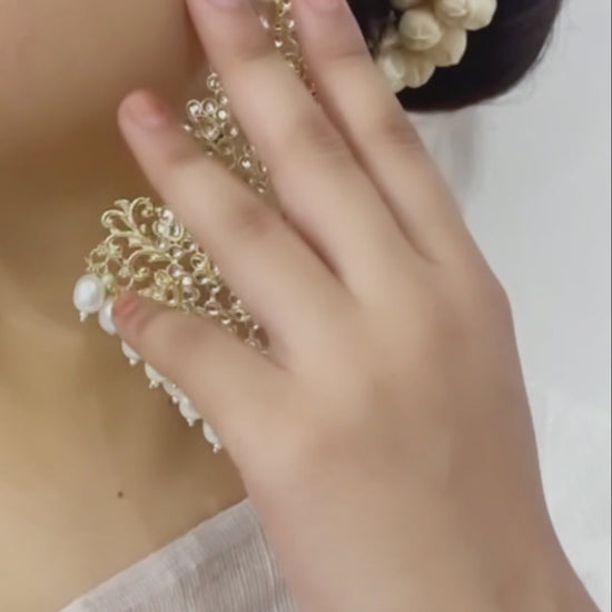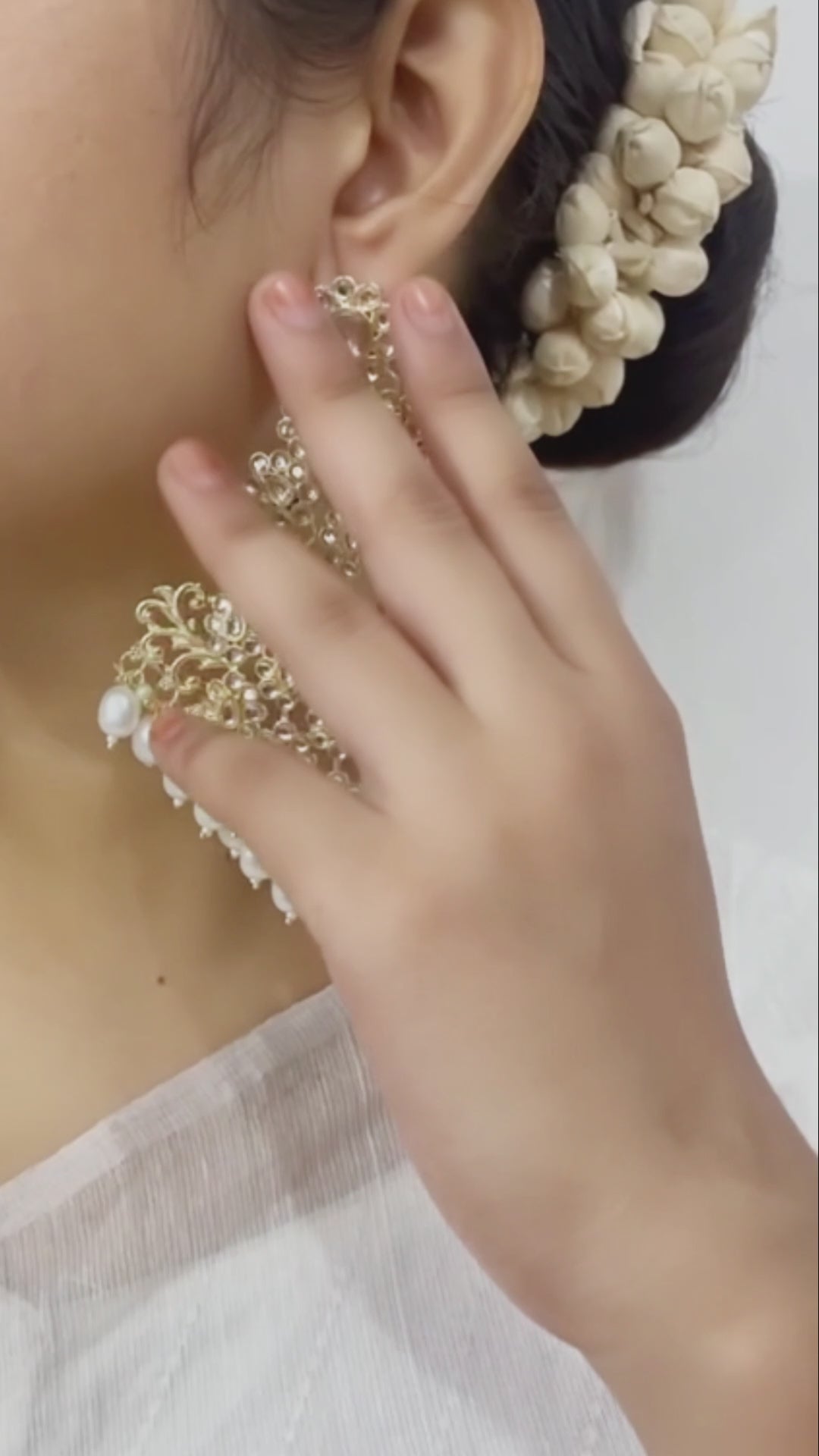 মহালতা প্রিয়া জুমকা—ঐতিহ্য ও আধুনিকতার অপূর্ব মেলবন্ধন। ঘন সোনালি কুন্দন কারুকাজ, সূক্ষ্ম ফুলের মোটিফ এবং নরম সাদা পার্ল ড্রপ—সব মিলিয়ে এটি এক রাজকীয়, নজরকাড়া জোড়া জুমকা।