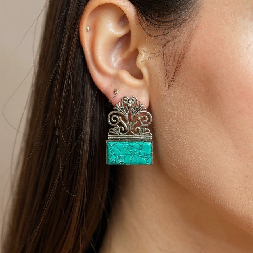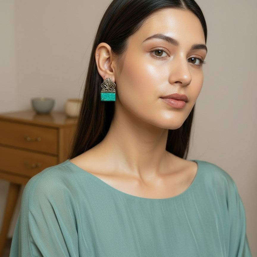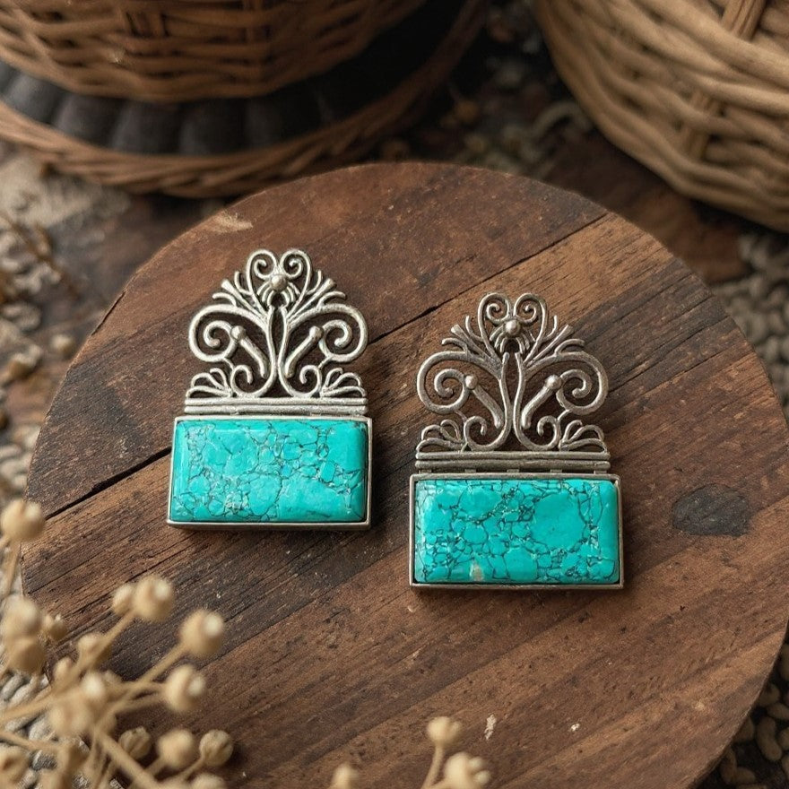উজ্জ্বল টারকোয়াইজ নীল পাথরের সঙ্গে অ্যান্টিক সিলভার কারুকাজ—যা যেকোনো লুককে মুহূর্তেই দেয় একটি ভিনটেজ, এলিগ্যান্ট টাচ।