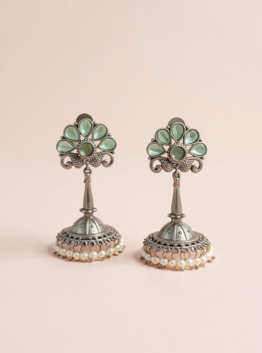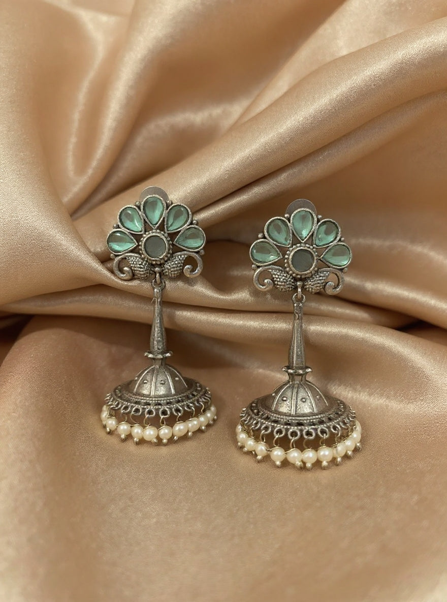 মিহরা মিণ্ট জালি ঝুমকা ঐতিহ্যবাহী সিলভার টোন আর সফট মিণ্ট গ্রিন স্টোনের এক অনন্য সংমিশ্রণ। উপরের ফ্লোরাল মোটিফে মিণ্ট শেড স্টোন আর নিচের হ্যান্ডক্রাফটেড ঝুমকা শেপ—সব মিলিয়ে এটি একটি ক্লাসিক অথচ গ্রেসফুল ডিজাইন।