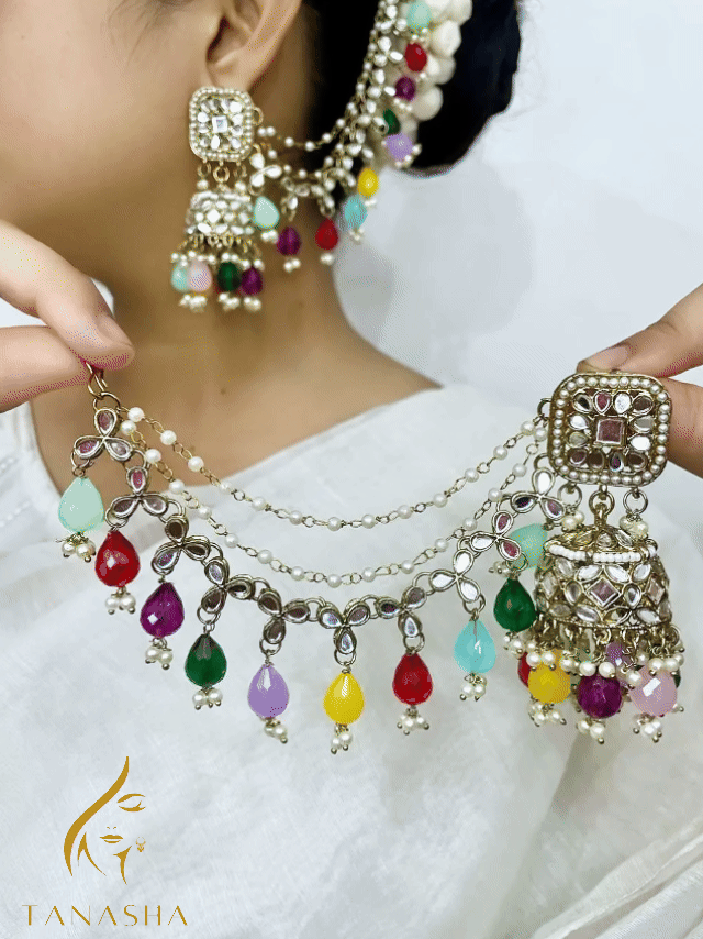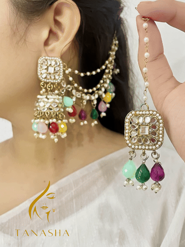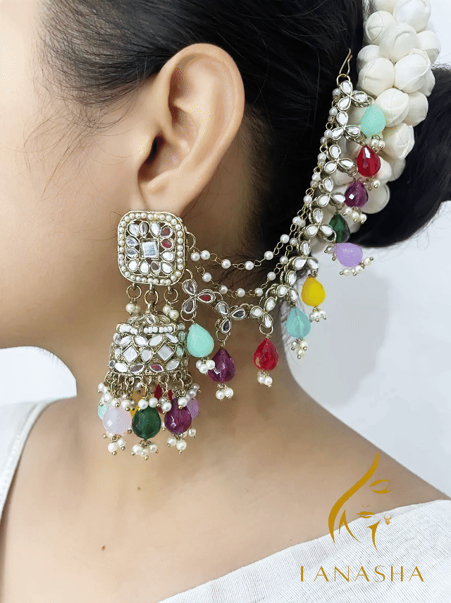 প্রতিটি দুলে ঝুলে থাকা বর্ণিল পাথর যেন একেকটি রঙিন স্বপ্ন, যা মিশে গেছে মুক্তোর কোমল জৌলুসের সাথে। উপরের কুন্দন সেটিং ও ডাবল চেইন ডিজাইন দিয়েছে এক অনবদ্য রাজকীয় ছোঁয়া, যা ব্রাইডাল, হালদি, কিংবা যেকোনো উৎসবের সাজে আনবে এক সম্পূর্ণতা।