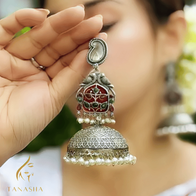 রশ্নি সিলভার ঝুমকা তৈরি হয়েছে সূক্ষ্ম কারুকাজে, রূপালি ফিনিশে এবং লাল-সবুজ এনামেল ডিজাইনে সাজানো। নিচের মুক্তোর দুলকানায় ঝরে পড়ে রাজকীয় আভা, যা তোমার লুকে এনে দেবে এক অনন্য জেল্লা।