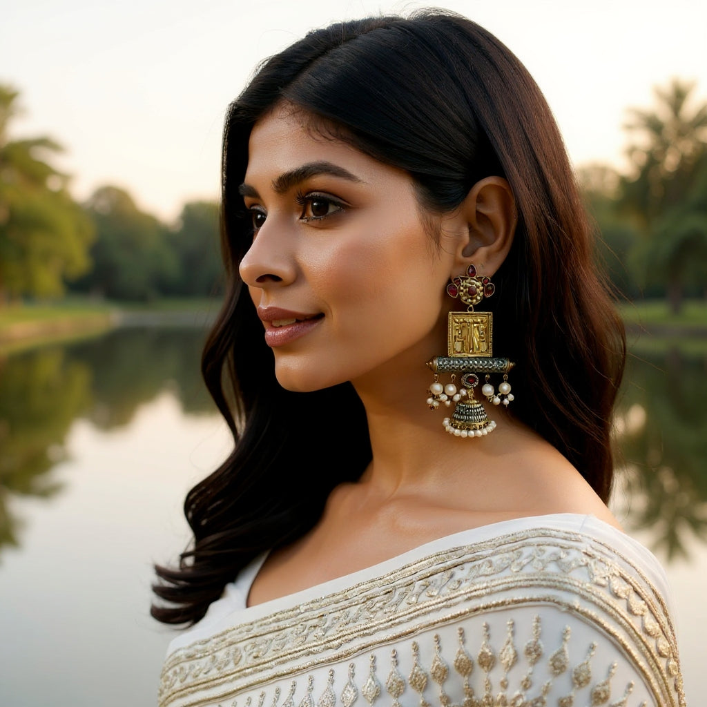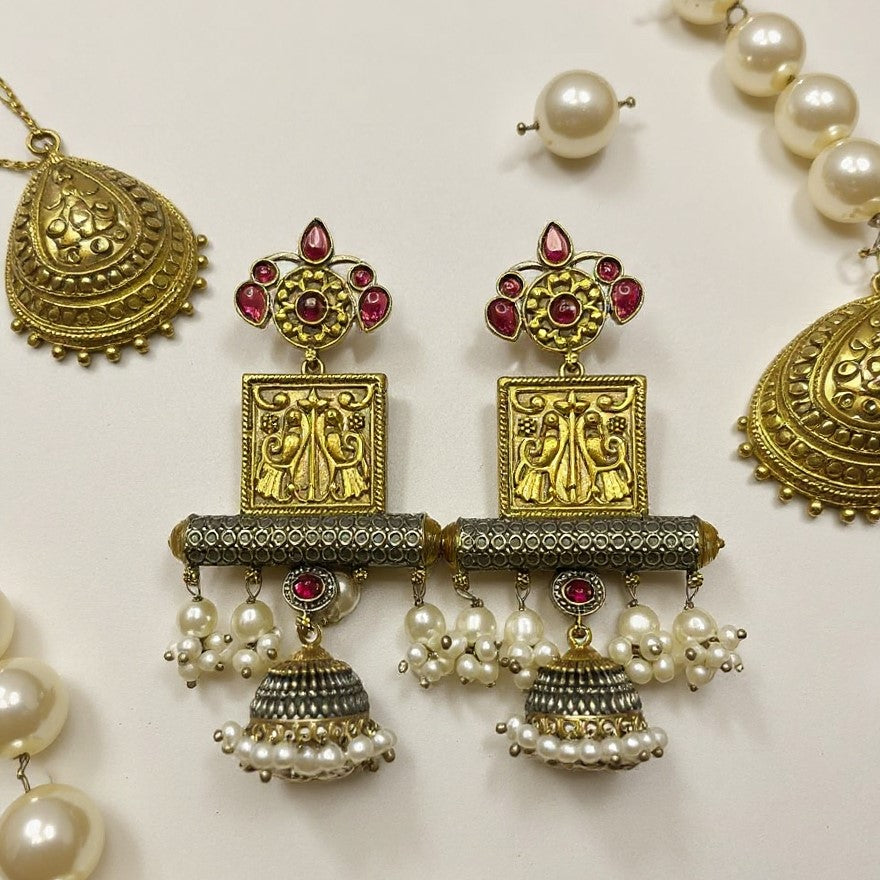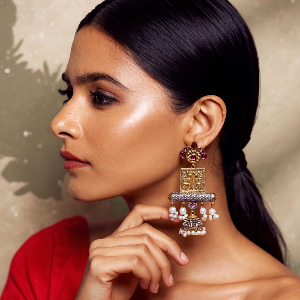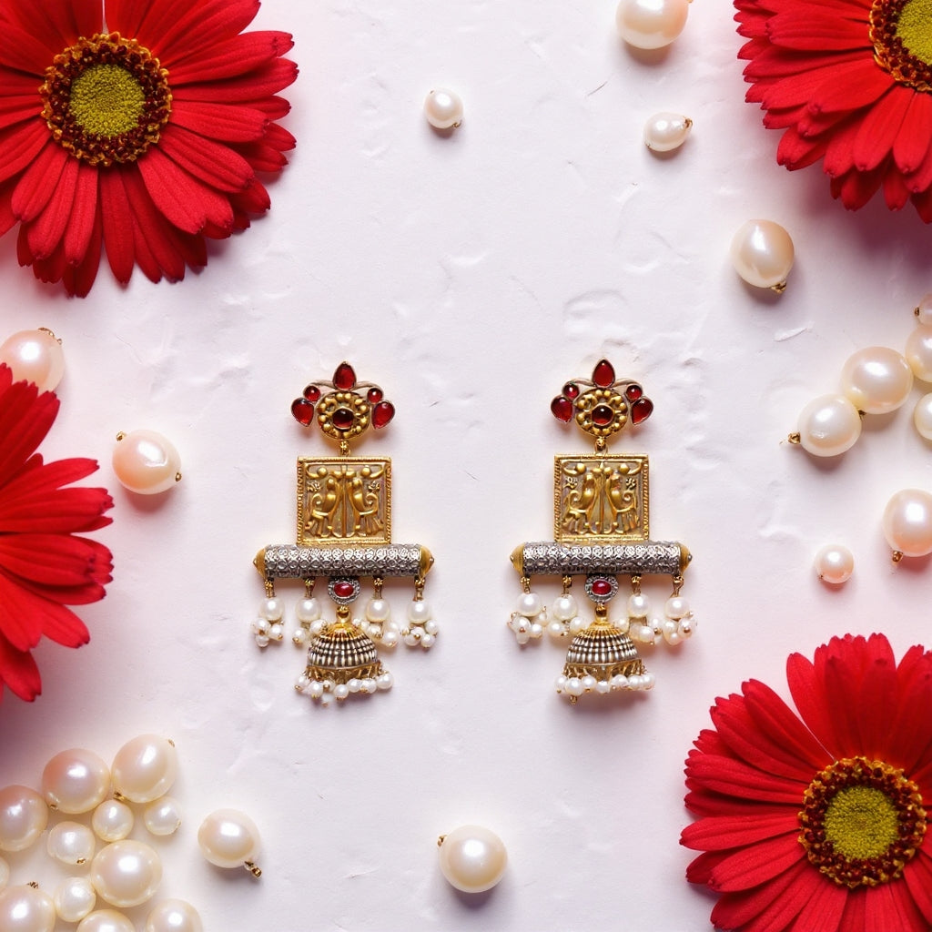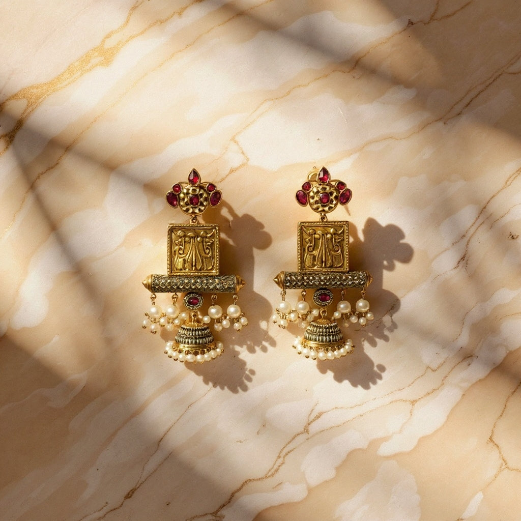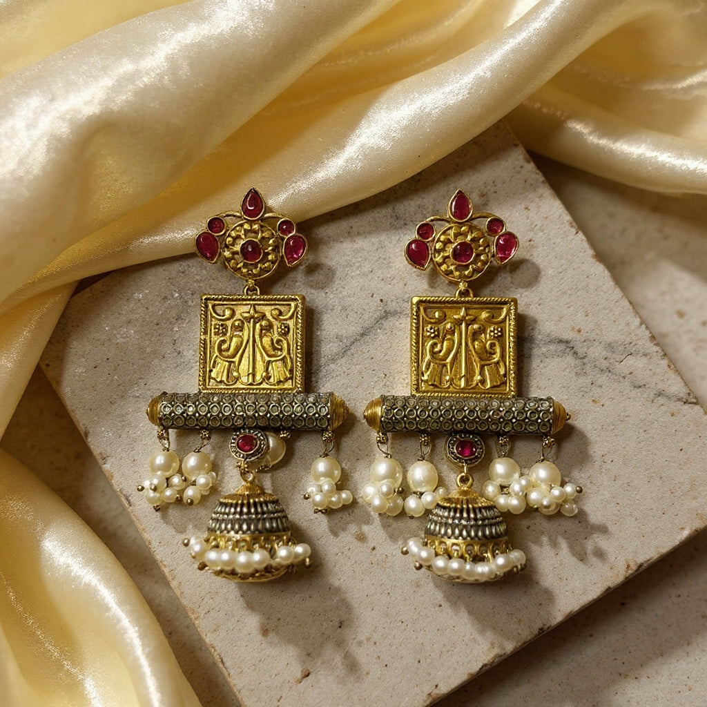 রুবিনা রাজকন্যা টেম্পল ঝুমকা এক অনন্য এথনিক মাস্টারপিস, যেখানে ক্লাসিক টেম্পল মোটিফ, রুবি রেড স্টোন ও পার্ল ড্রপের নিখুঁত সমন্বয় রয়েছে। অ্যান্টিক গোল্ড ফিনিশ ও সিলভার টোনের মিশ্রণ এটিকে দিয়েছে একটি রাজকীয় ও হেরিটেজ লুক।