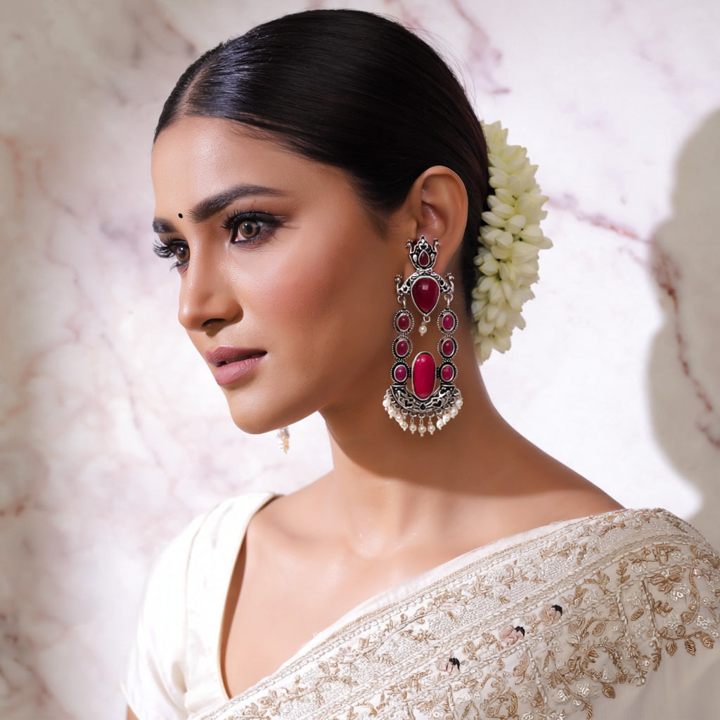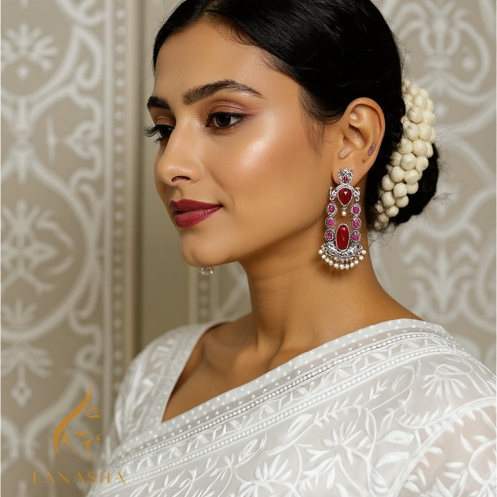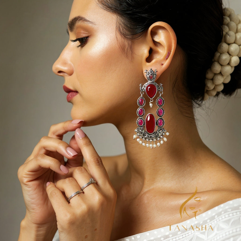 গভীর রুবি রেড স্টোন, দুই পাশে পিঙ্ক ওভাল স্টোনের ক্লাসিক কম্বিনেশন এবং অ্যান্টিক সিলভার ফিনিশ—সবকিছু মিলিয়ে দুলটি পায় এক রাজকীয়, হেরিটেজ-স্টাইল লুক।