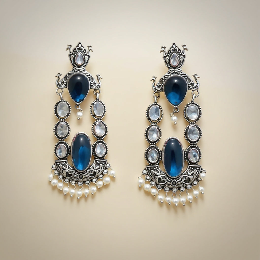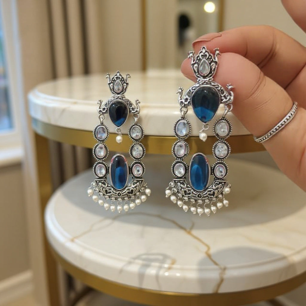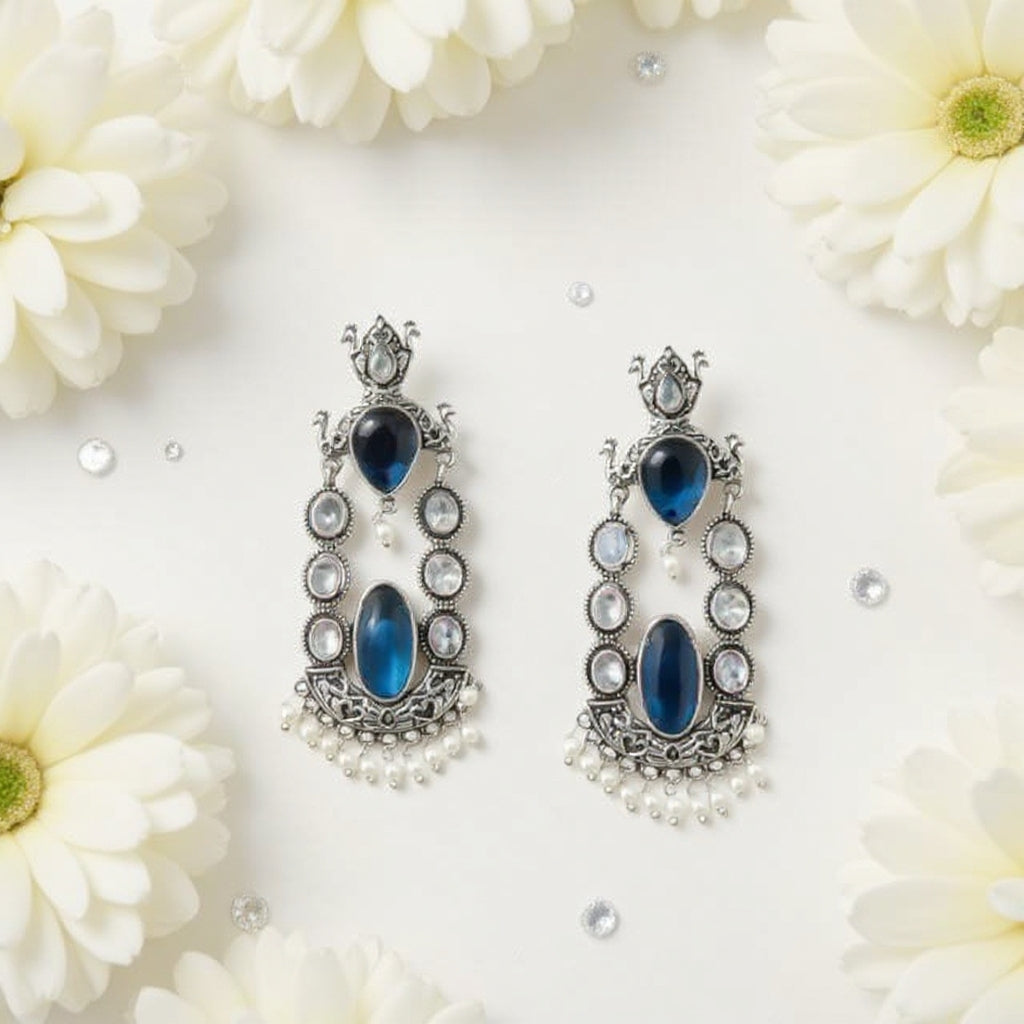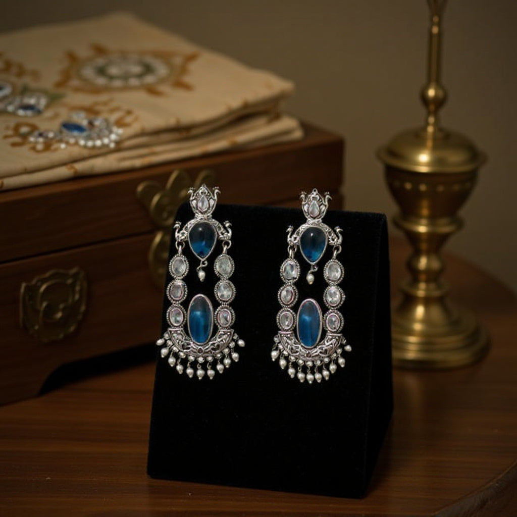 গভীর রুবি নীল স্টোন, দুই পাশে ওহাইট স্টোনের ক্লাসিক কম্বিনেশন এবং অ্যান্টিক সিলভার ফিনিশ—সবকিছু মিলিয়ে দুলটি পায় এক রাজকীয়, হেরিটেজ-স্টাইল লুক।