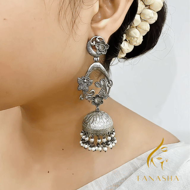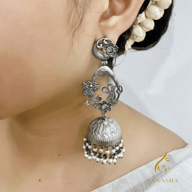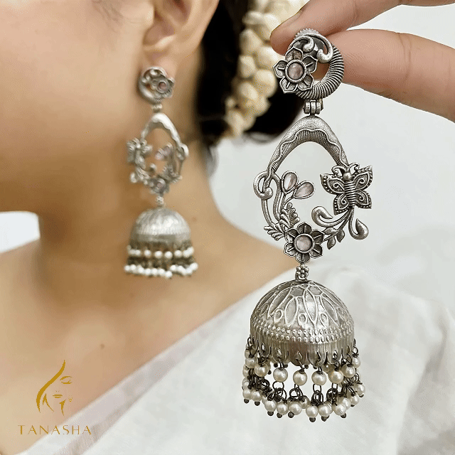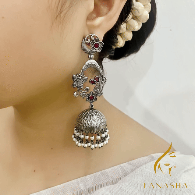 চমৎকার ফুল আর প্রজাপতির নকশা, লাল পাথরের মনোমুগ্ধকর ছোঁয়া আর মুক্তোর ঝালর মিলিয়ে তৈরি এই দুল তোমার লুকে আনবে এক রাজকীয় অথচ নরম এলিগেন্স।