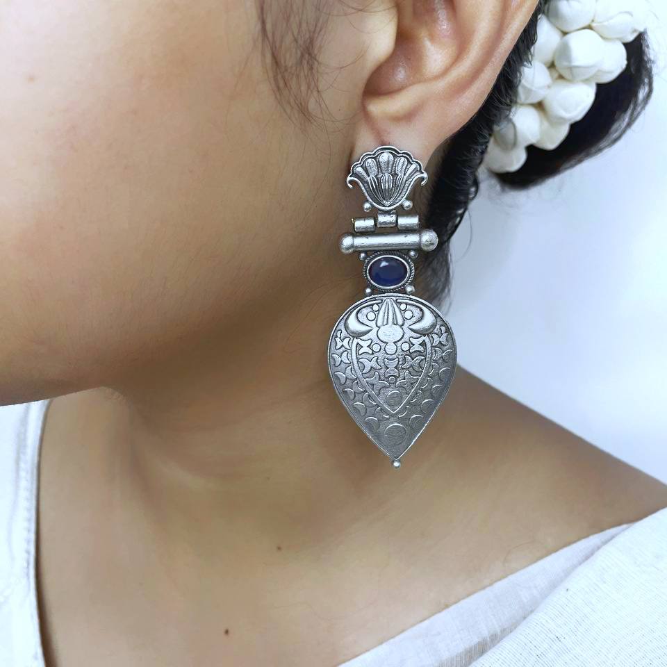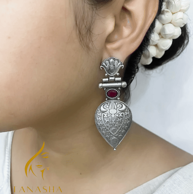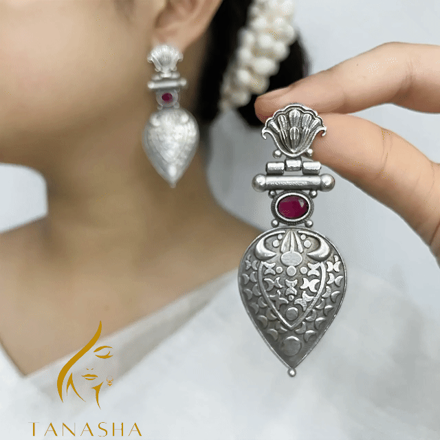রূপরাগা সিলভার ঝুমকা – হাতে তৈরি এই দুলে আছে রাজকীয় খোদাই কাজ ও রুবি রঙের স্টোনের ঝলক।