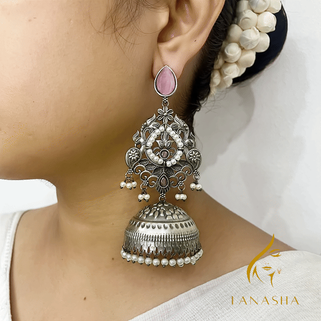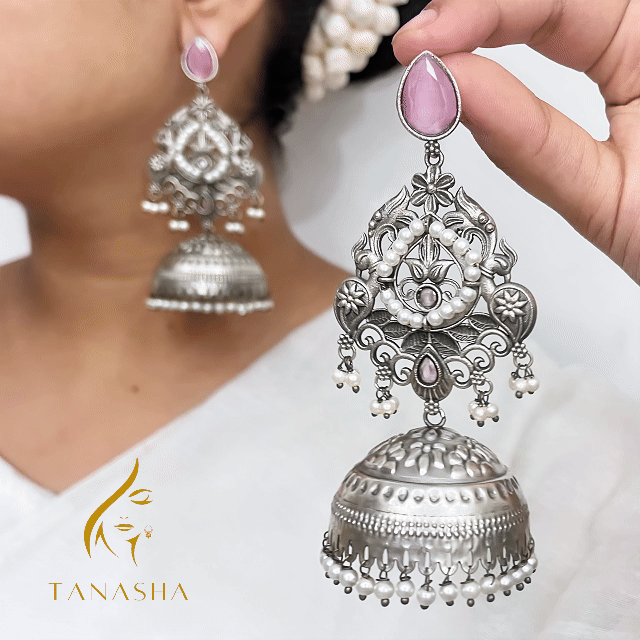 নরম গোলাপি পাথর, মুক্তার বৃত্ত আর সূক্ষ্ম রুপালি খোদাইয়ের মিশ্রণে তৈরি এই দুলে রয়েছে অনিন্দ্য ঐশ্বর্য। নিচের গম্বুজ অংশে রয়েছে মসৃণ অক্সিডাইজড ফিনিশ, যা প্রতিটি লুকে এনে দেয় ক্লাসিক পরিপূর্ণতা।