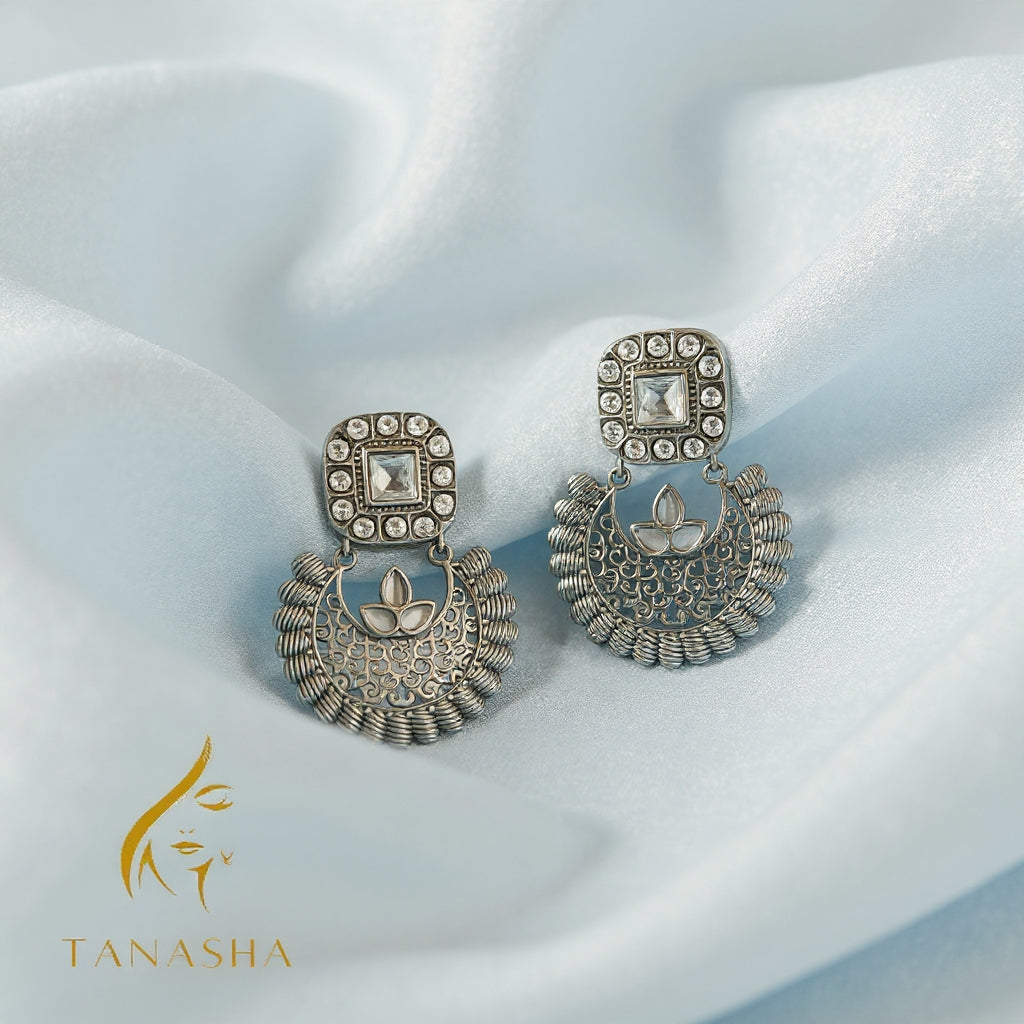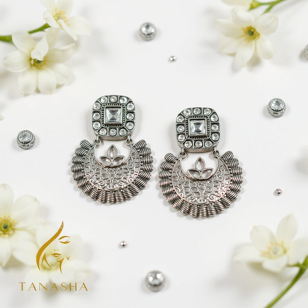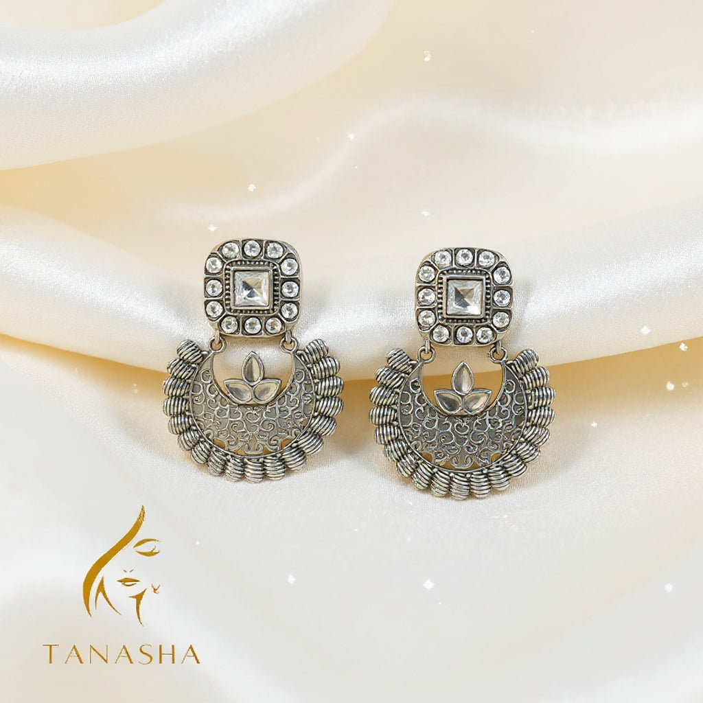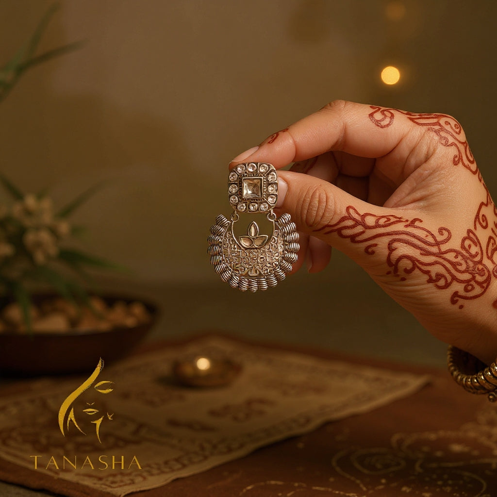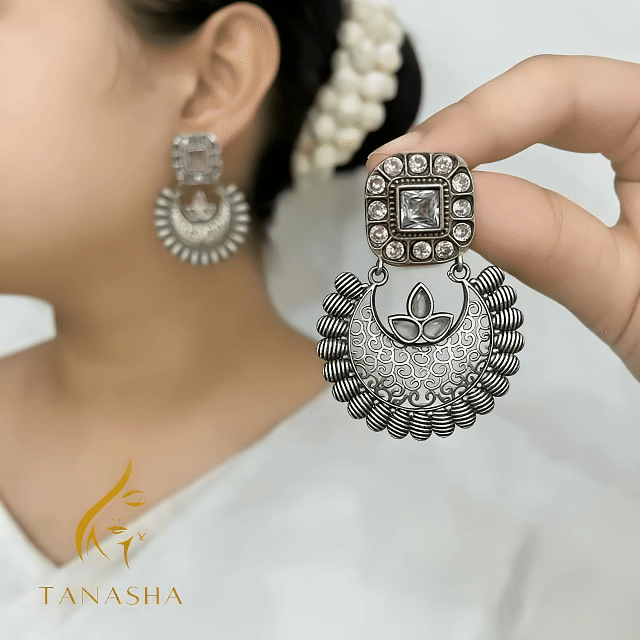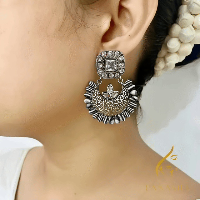 রূপালিকা এলিগেন্স স্টেটমেন্ট ইয়াররিং—একটি সফট গ্ল্যাম, অ্যান্টিক সিলভার টোন এবং রিফাইনড ক্রিস্টাল ডিটেইলসের নিখুঁত মিশ্রণ।