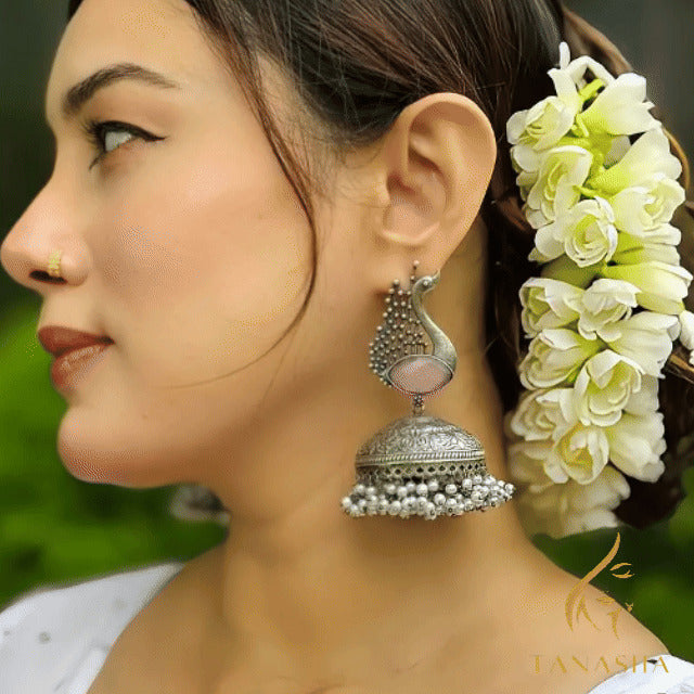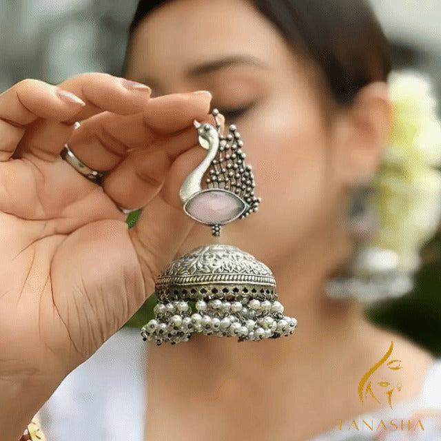 ঝুমকার শীর্ষে রয়েছে রাজহাঁসের অনন্য নকশা, তার বুকে স্নিগ্ধ গোলাপি স্টোন যা পুরো ডিজাইনকে করে তোলে আরও মোহনীয়। নিচের দিকে খচিত কারুকাজ আর ঝুনঝুনে ঘণ্টার মতো ছোট ছোট বিডস—সব মিলিয়ে এটি যেন এক টুকরো শিল্পকর্ম।